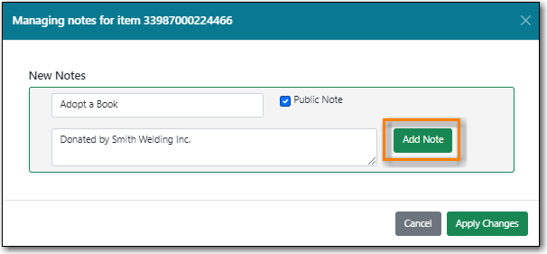 Used for information specific to the item. | Notes set as public will display in the public catalogue. | |